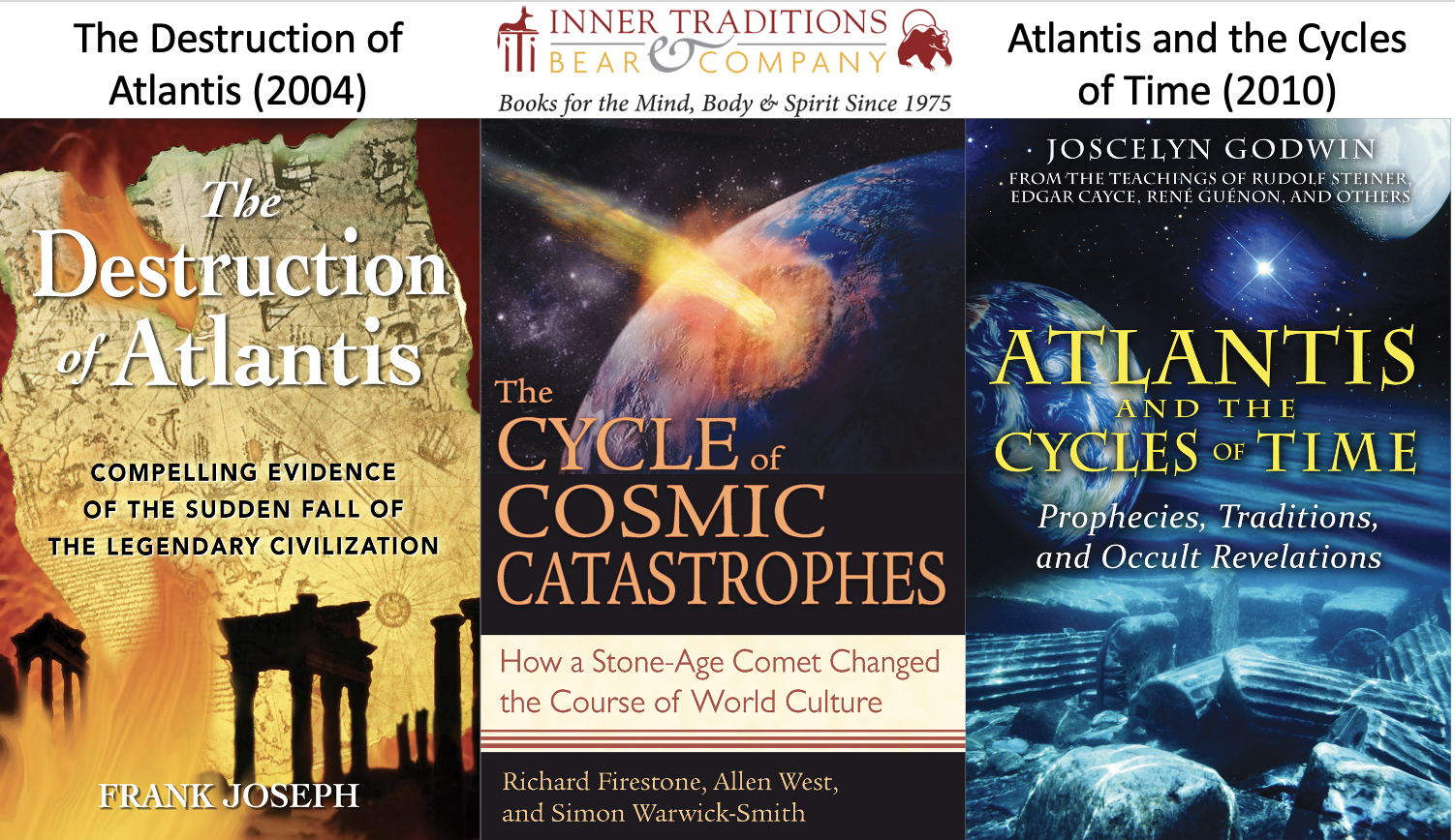 “Destruction of Atlantis”, “Cycle of Cosmic Catastrophes", and “Atlantis and the Cycles of Time” were all published by Inner Traditions/Bear & Company. They are all in the publisher’s category, “Ancient Mysteries”.