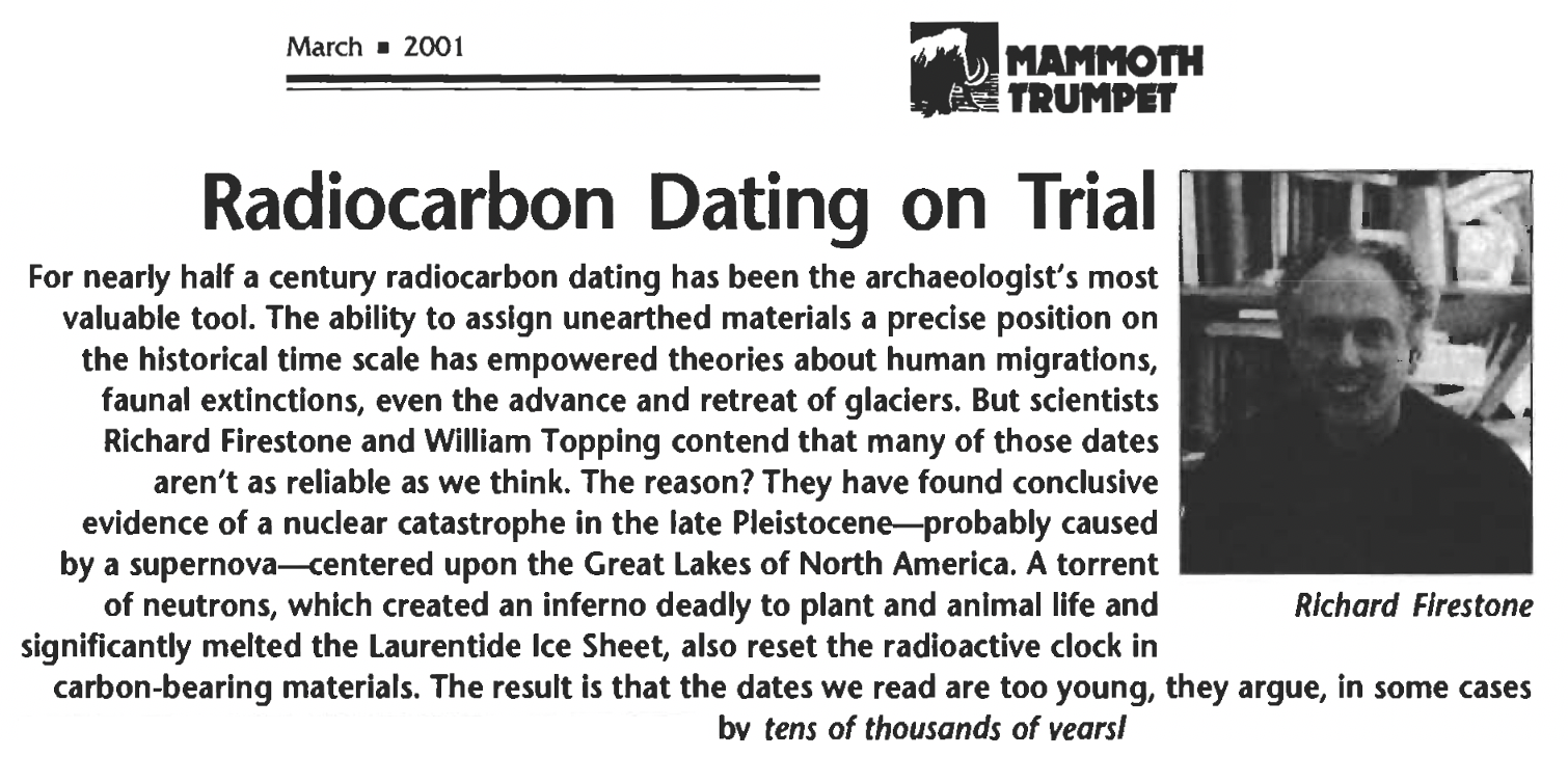 “For nearly half a century radiocarbon dating has been and indespensable tool of archaeologists, anthropologists, paleontologists, geologists. Chronologies of human migration, fauna extinctions, even glacial movements have been based with absolute confidence on the dating of evideontiary carboniferous materials. Firestone and Topping contend that radiocarbon dates for sites in North America are suspect, the result of a late-Pleistocene cosmic ray bombardment that created vast amounts of radiocarbon and thereby re-set the clock by which radiocarbon dating measures the passage of time... Firestone and Topping’s theory challenges the chronology that underpins many theories. Consequently, it casts doubt on many theories themselves.”